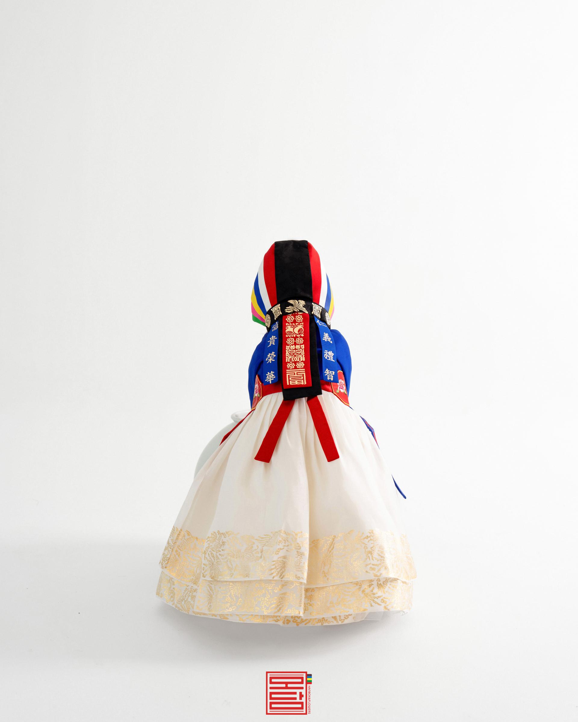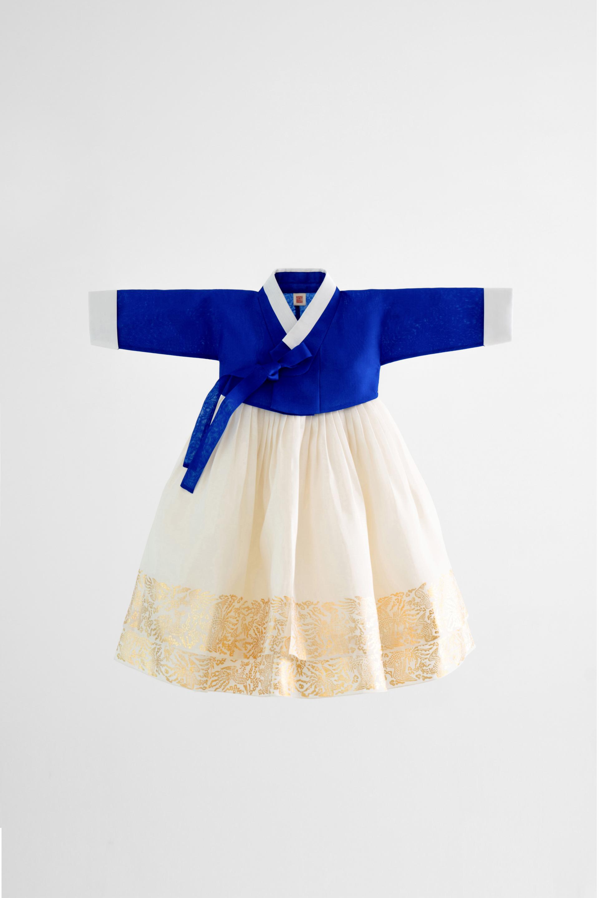 짙푸른 저고리와 은은한 금박이 흐르는 겹 흰 치마,
